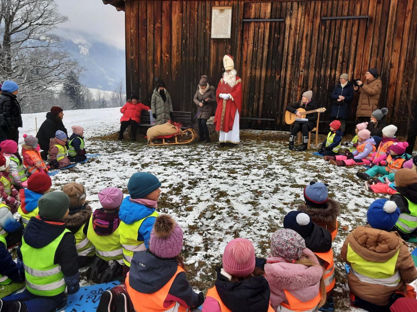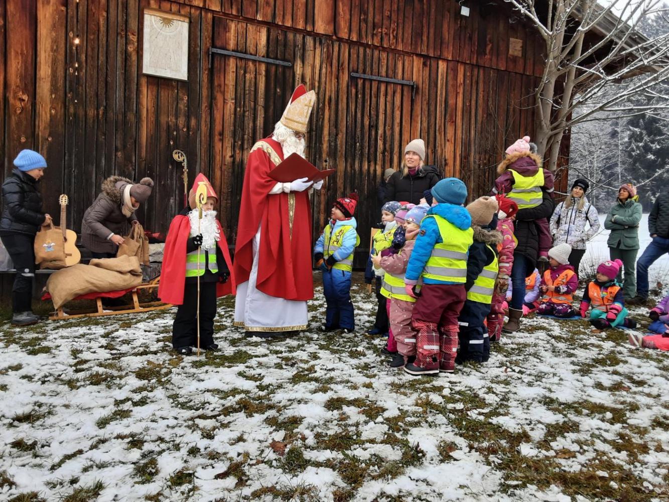 Am 5. Dezember sind wir gemeinsam mit den Kindern durch den stimmungsvollen Winterwald nach Elsenstätt spaziert und haben dort voller Vorfreude den heiligen Nikolaus empfangen. Auch die Eltern waren an diesem besonderen Tag mit dabei, als der Nikolaus aus dem verschneiten Wald zu uns kam. Er sprach zu den Kindern und freute sich über das Programm, welches sie für ihn vorbereitet haben und beschenkte die Kinder mit seinen Gaben.